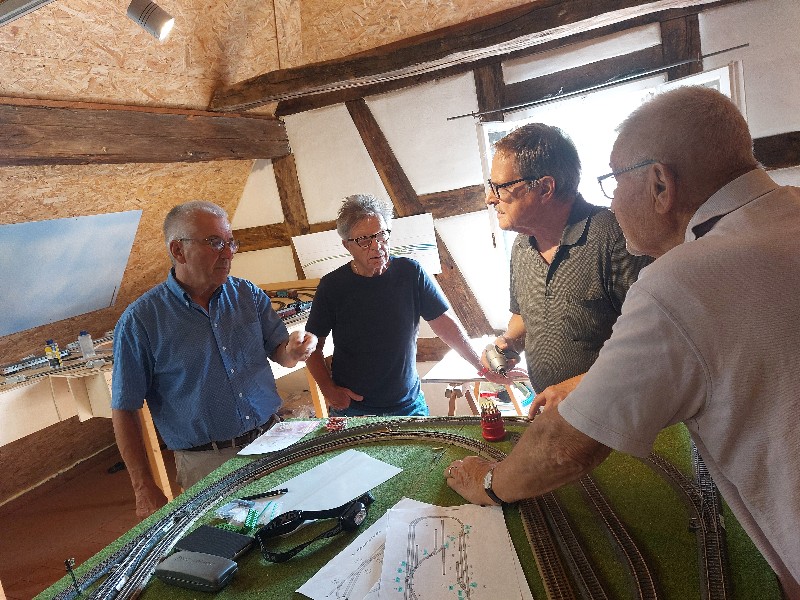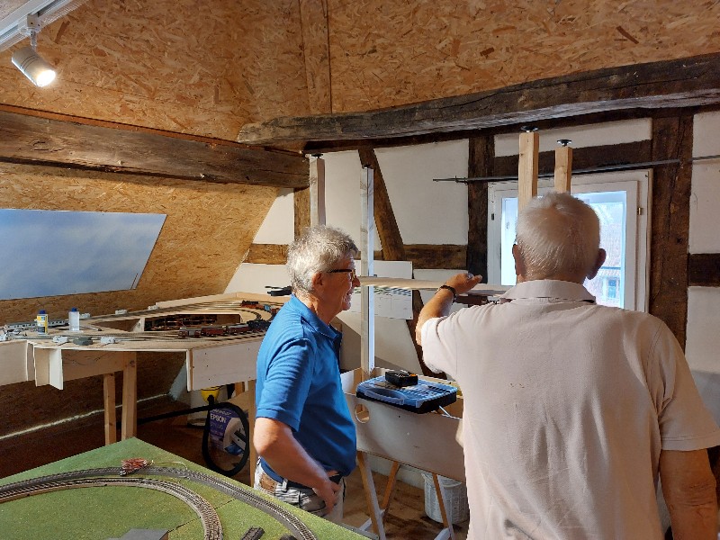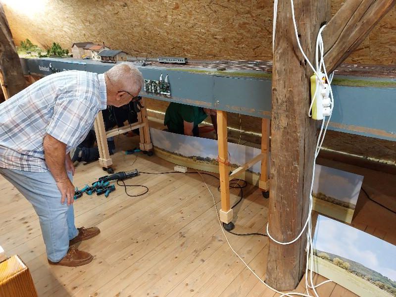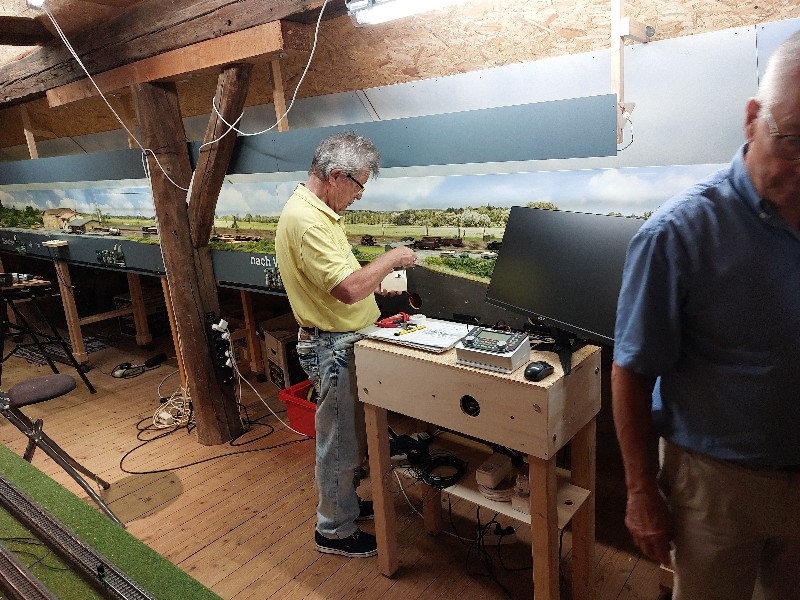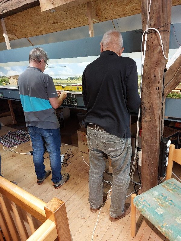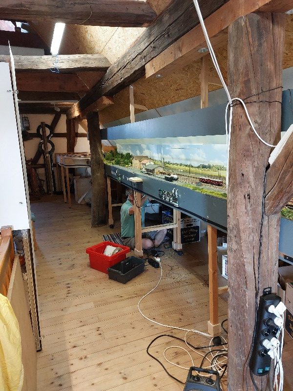 Bei sommerlicher Hitze von 36 C wurde weitergebaut. Nachdem die Signale angeschlossen waren wurde das Vorsignal angeschlossen. Eine große Veränderung gab es in der Raummitte. Die AC-Anlage wurde von ihrem bisherigen Standort in die Mitte umgestellt. An ihren Platz kamen 2 Module Klingenmünster.