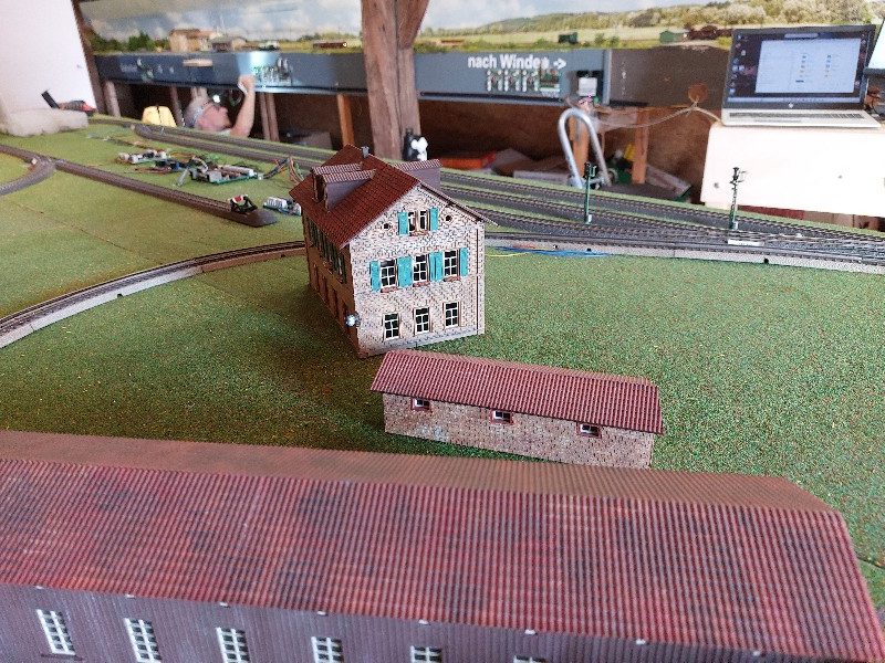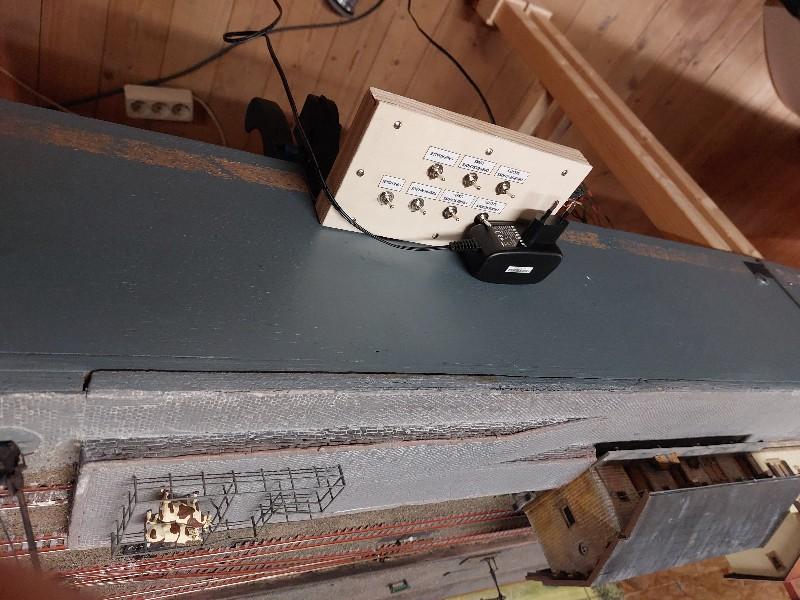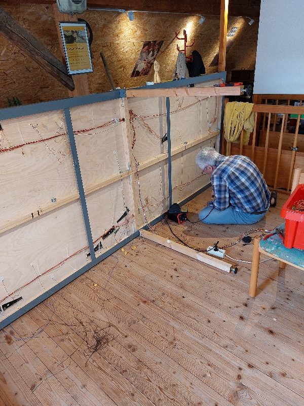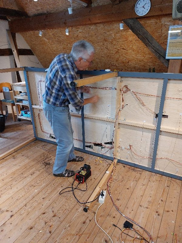 Arbeiten an der Bahnhofbeleuchtung. Die Beleuchtung kann jetzt auch über PC gesteuert werden. Fehlersuche W2.5. Die alte Elektrik der Klingenmünster Module wurde entfernt.