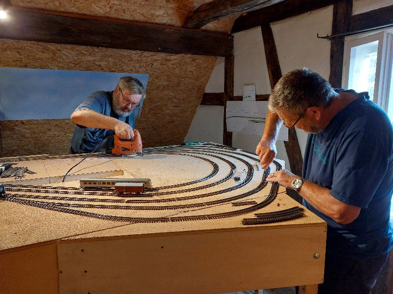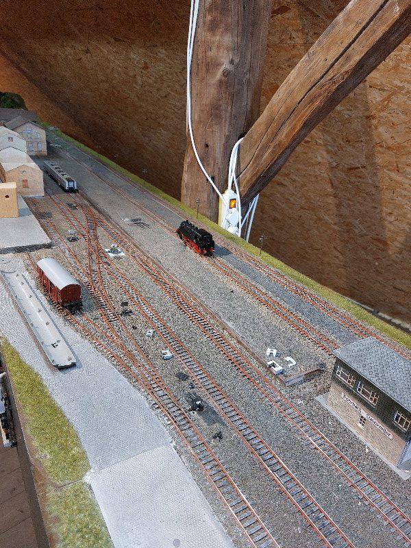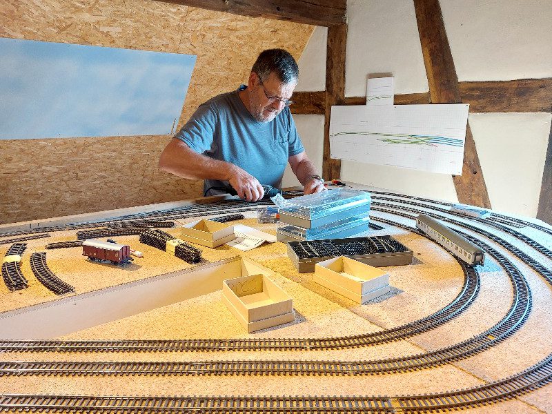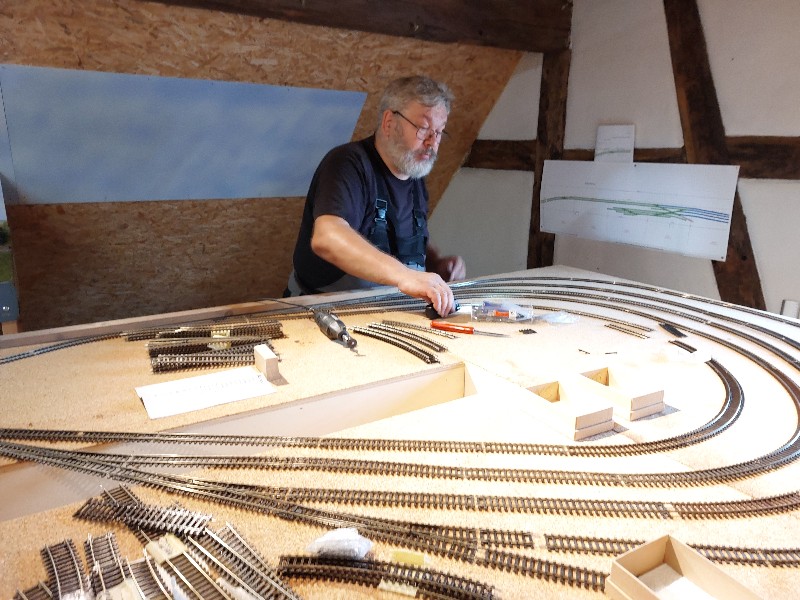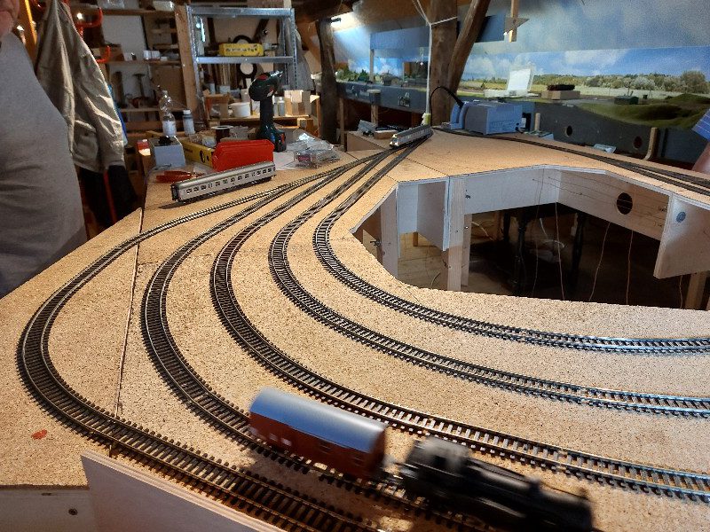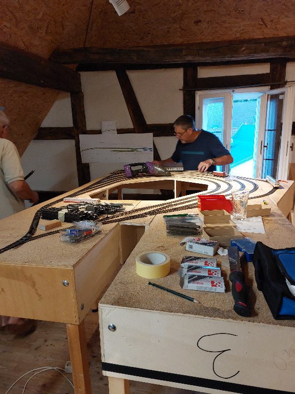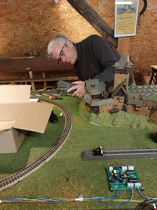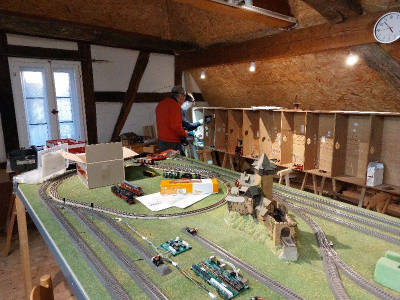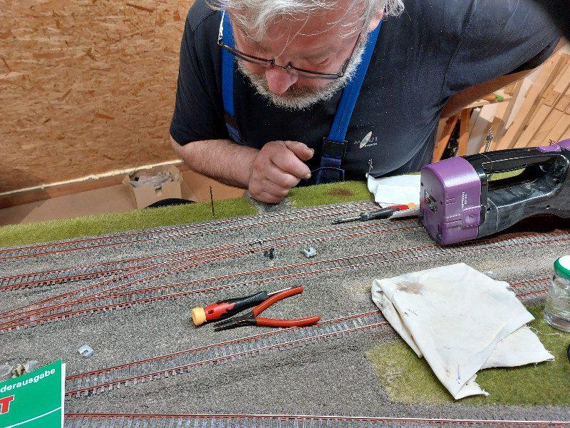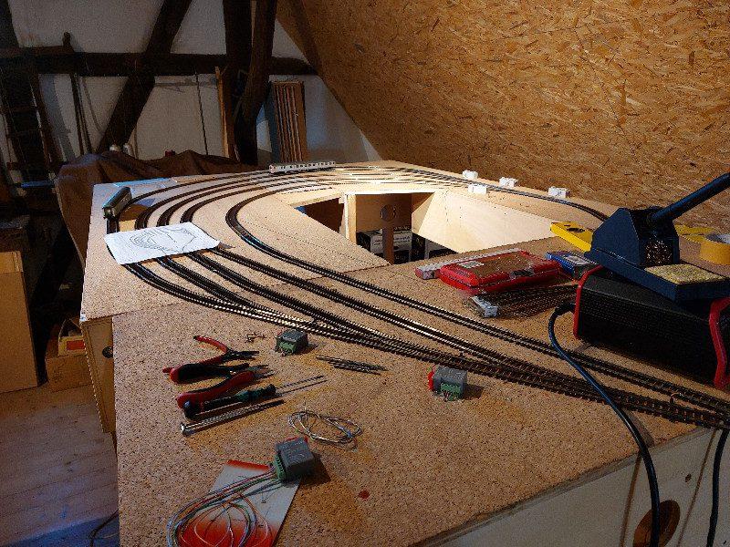 Arbeiten an der AC-Anlage. Geplant sind zusätzliche Rückmelder. Dazu muss aber ein Teil der Gleise demontiert werden und um Trennstellen einzubauen. Zusätzlich wurde auf de DC-Anlage ein Programiergleis eingebaut.