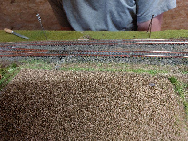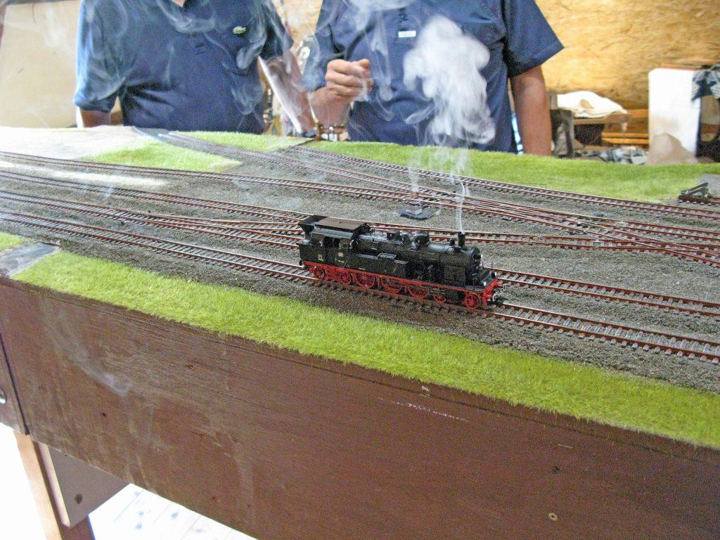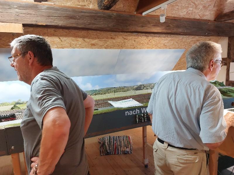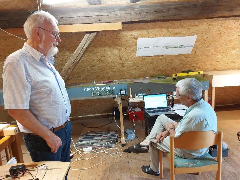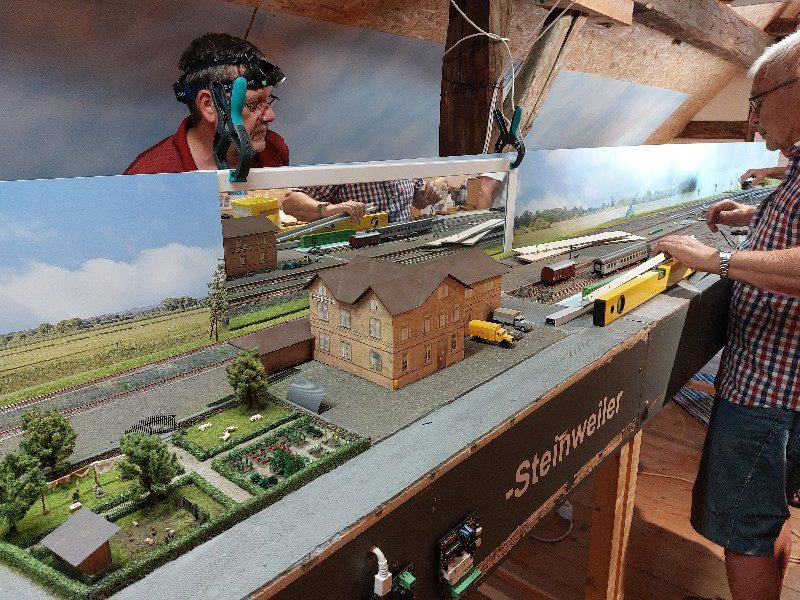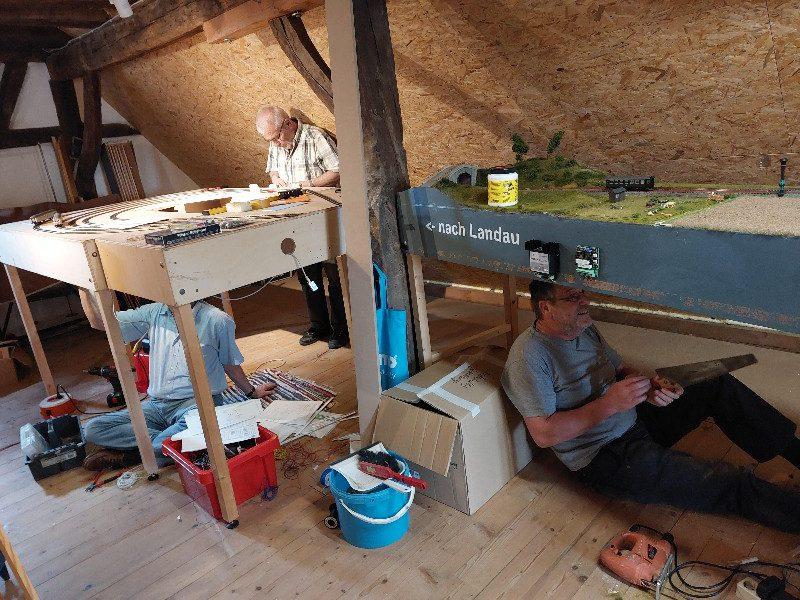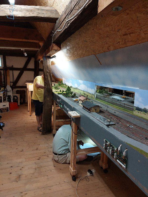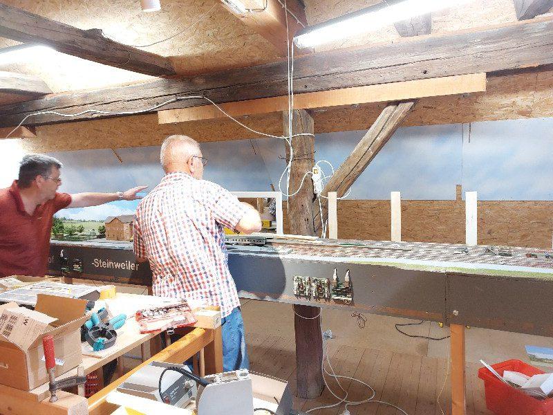 Bei sommerlicher Hitze von 36 C wurde weitergebaut. Nachdem die Signale angeschlossen waren wurde das Vorsignal angeschlossen. Eine große Veränderung gab es in der Raummitte. Die AC-Anlage wurde von ihrem bisherigen Standort in die Mitte umgestellt. An ihren Platz kamen 2 Module Klingenmünster.