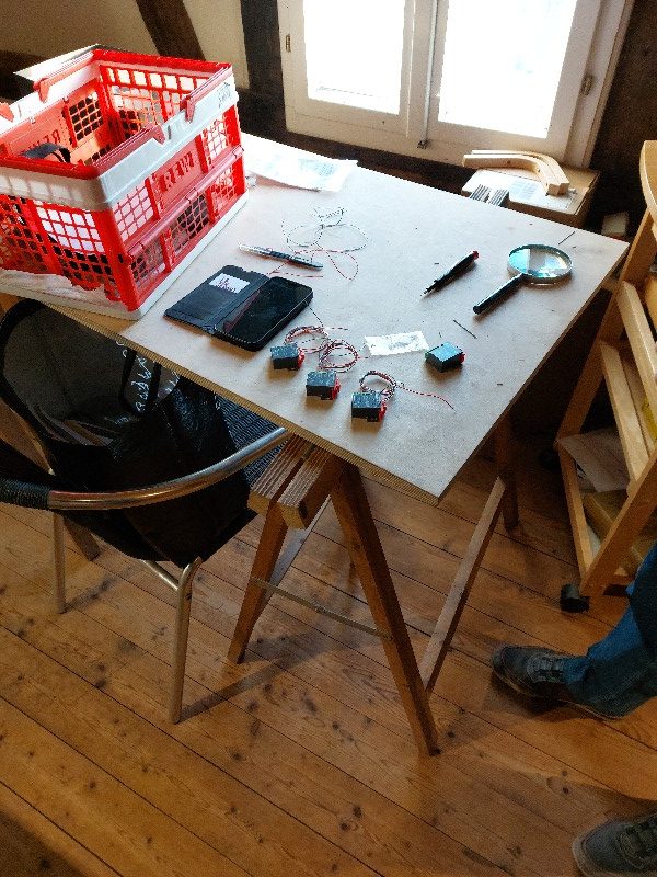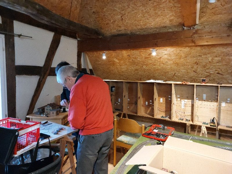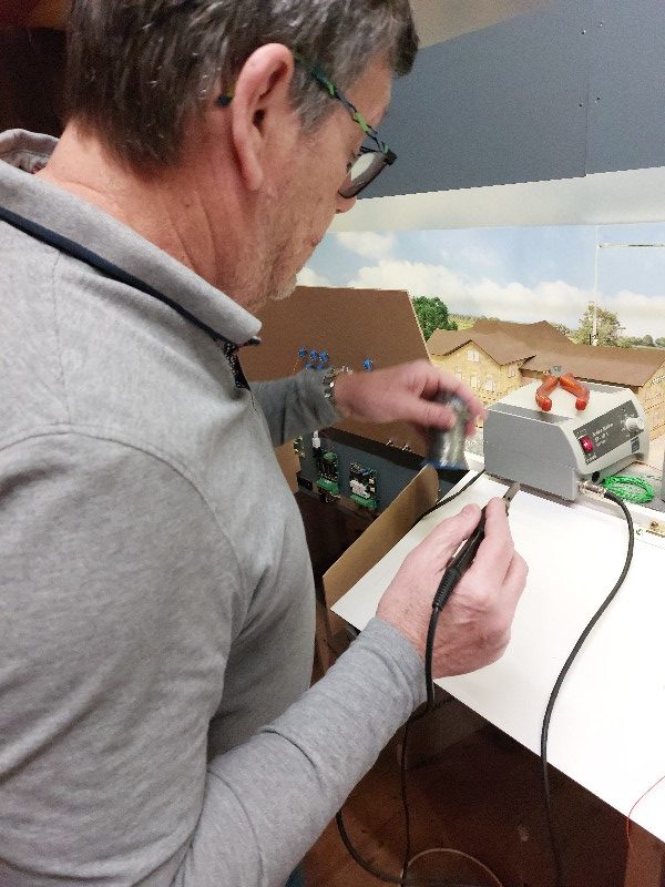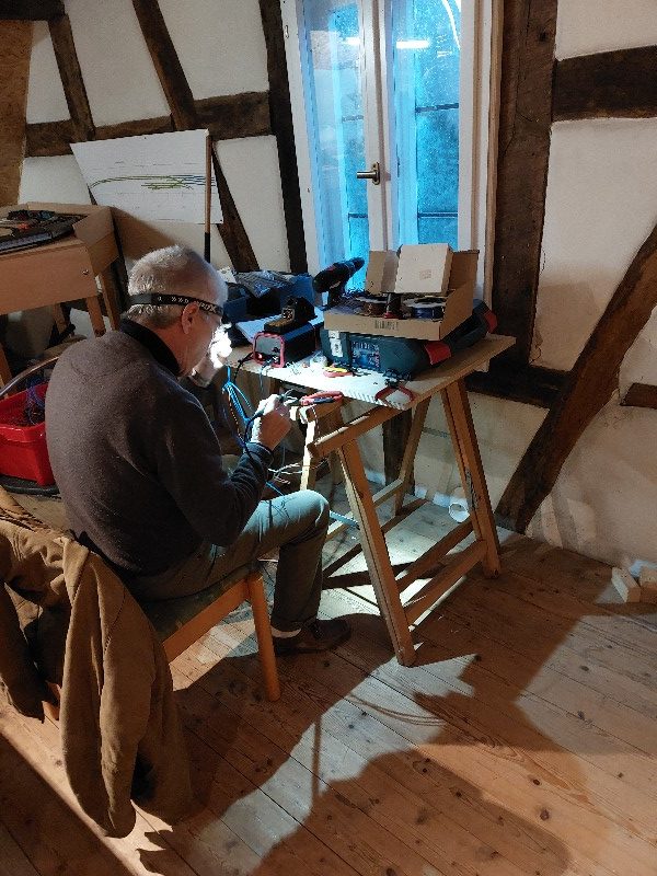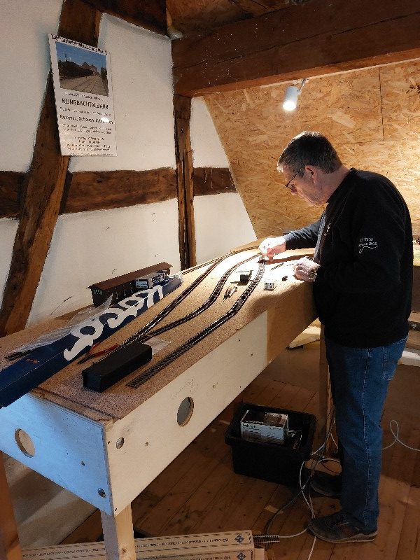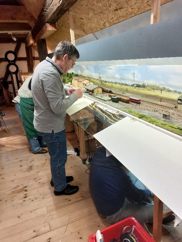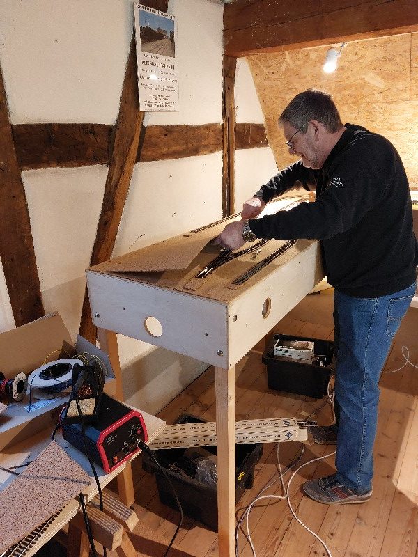 Die beiden Module für Klingenmünster wurden verbunden. Die Gleise wurden getestet einschließlich der Trennstellen. Die ursprüngliche Elektrik wurde entfernt und durch eine neue ersetzt. Die Weichenantriebe wurden getestet. Leider müssen diese ersetzt werden. Patrick hat an einer Weichenlaterne gearbeitet.