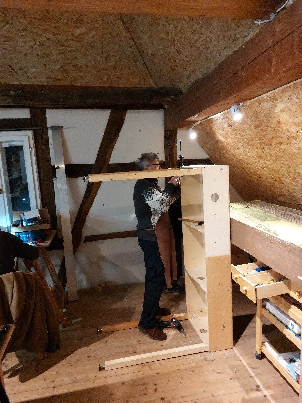 An den beiden Klingenmünster Modulen sowie am ersten Verbindungsmodul wurden Beine montiert und aufgestellt. Einige weise Flächen wurden mit Plakaten verschönert.