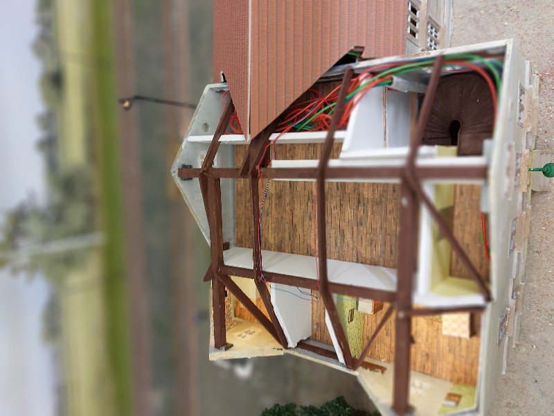 Wir wollen das Bahnhofsgebäude in den fünfziger Jahren darstellen. Ausgehend von alten Plänen und Fotos wurde das Bahnhofsgebäude Rohrbach in 3D modelliert. Es wurde in mehreren Runden Zeitzeugen vorgestellt und Details geklärt, von der Treppe, den Fenstern bis hin zum Fahrkartenschalter. Dann erfolgte ein erster Druck mit 3D Drucker. Ein zweiter Druck folgte und Patrik begann mit dem Gravierstift die Textur aufzubringen und mit Air Brusch die Farbe.