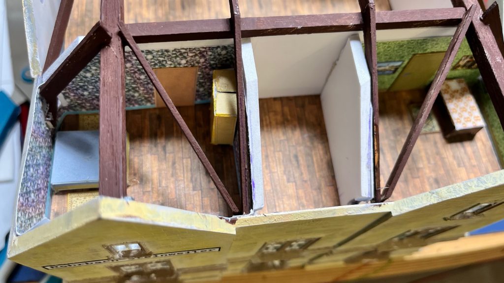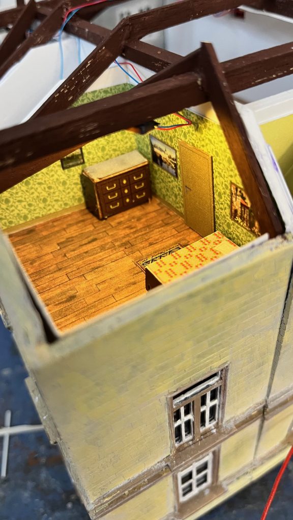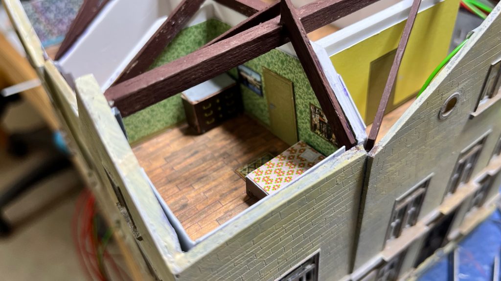Patrick ritzte mit einem Skalpell die Mauerstruktur nach und kolorierte die Außenwände mit Airbrush. Nach Rücksprache mit Zeitzeugen wurde für die Böden eine Holzoptik gewählt.